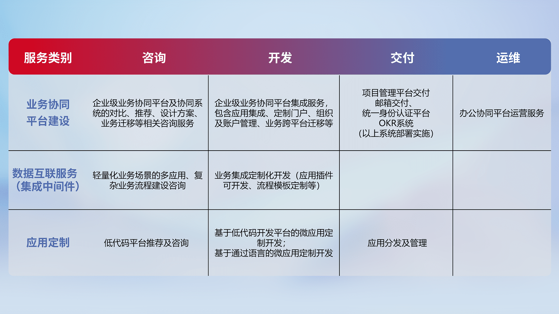 针对钉钉、、、企微、、IDaas等平台级产品提供产品的规划、、、方案、、交付、、、定制化开发等服务,,实现如统一协同办公、、智能客户服务、、、、混合会议管理、、智能数据查询、、、、等业务场景,,,,实现数字化转型。。