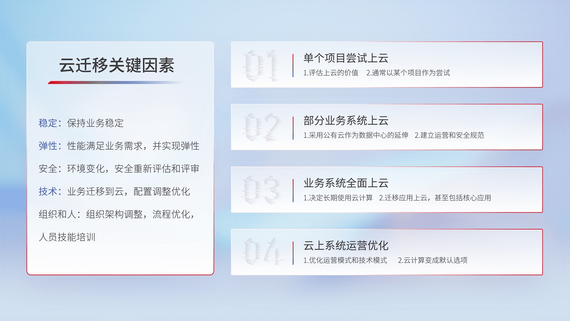结合实际业务,,,从规划设计、、、、云平台选型、、、、云原生改造、、、数据迁移、、、、集成交付,,,迁移全过程为客户识别最佳上云路径,,做好风险识别管理,,,,设计网络架构、、身份权限、、安全审计合规、、操作审计、、日志审计、、监控告警策略、、多站点容灾设计等,,,对云上基础设施进行整体规划,,,提升IT治理水平,,,,以满足弹性、、高可用、、高性能的需求。。